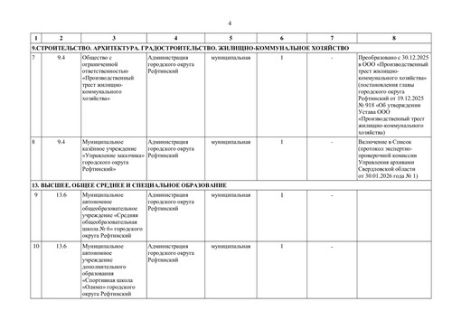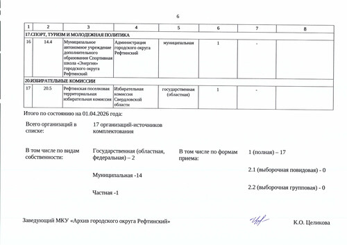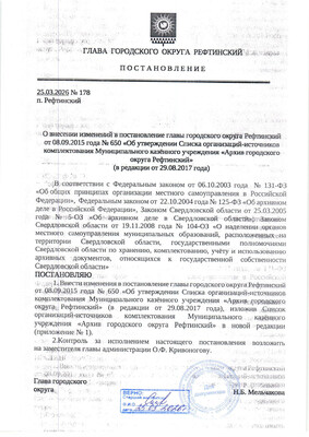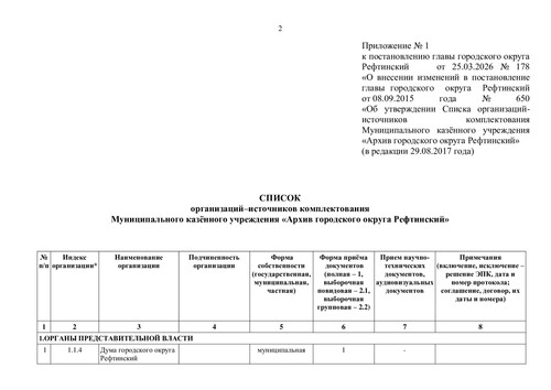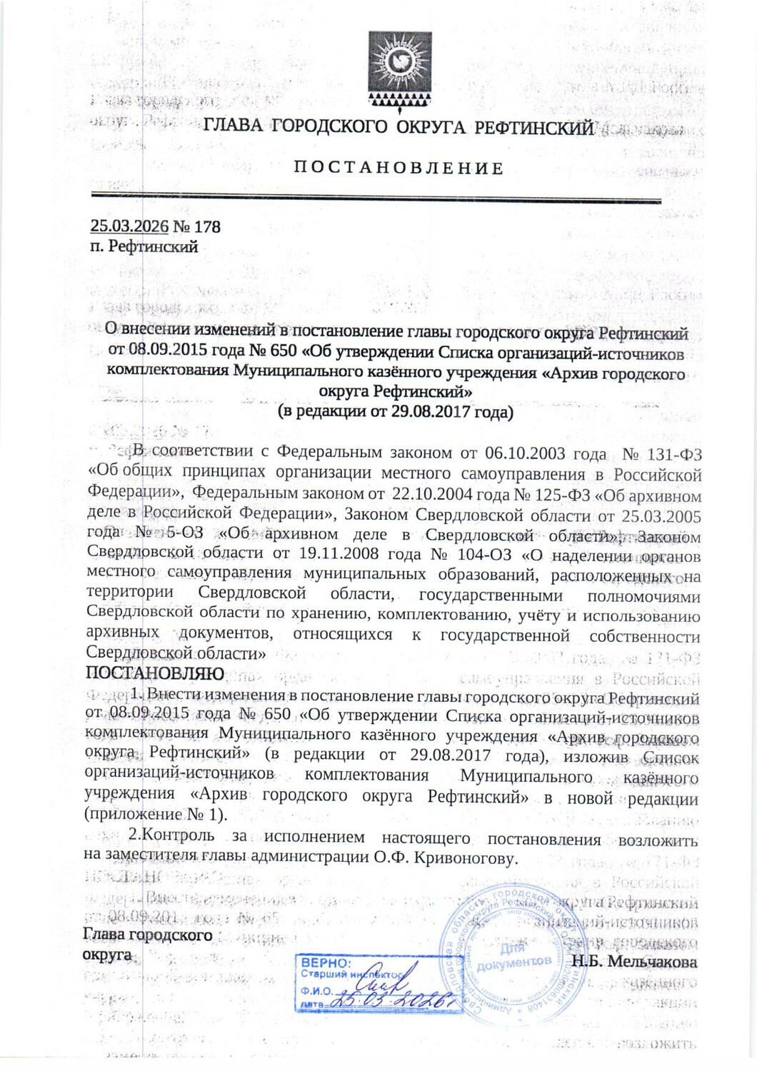 О внесении изменений в постановление главы городского округа Рефтинский от 08.09.2015 года № 650 «Об утверждении Списка организаций-источников комплектования Муниципального казённого учреждения «Архив городского округа Рефтинский»